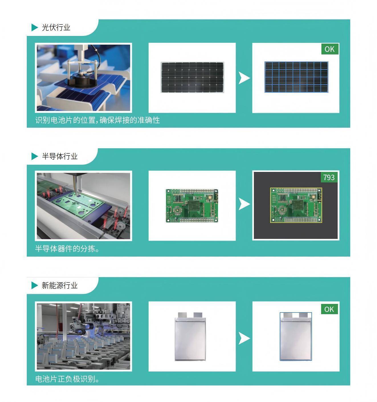 精密电子(元器件的识别与定位):高速识别与精确定位PCB板上的微小元器件(芯片、电容、电阻等),引导机器人精准完成贴装、焊接、点胶等工序,确保良品率。